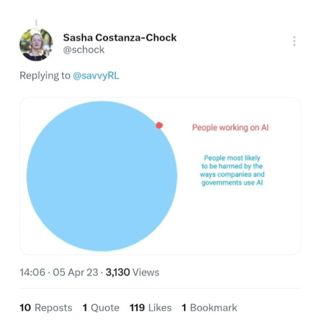 Then, I scrolled down to see how others were reacting to this position and was relieved to stumble upon Sasha Costanza-Chock’s reply to the tweet. They had taken the graphic and reworked it. The red dot now represented “people working on AI,” while the massive blue circle was labeled “people most likely to be harmed by the ways companies and governments use AI.” With a single edit, they had flipped the narrative entirely. What began as an elitist and technocratic joke aimed at mocking people who do not have a technical understanding of AI, was transformed into a powerful critique of power imbalances, systemic harm, and the exclusion embedded in AI systems.