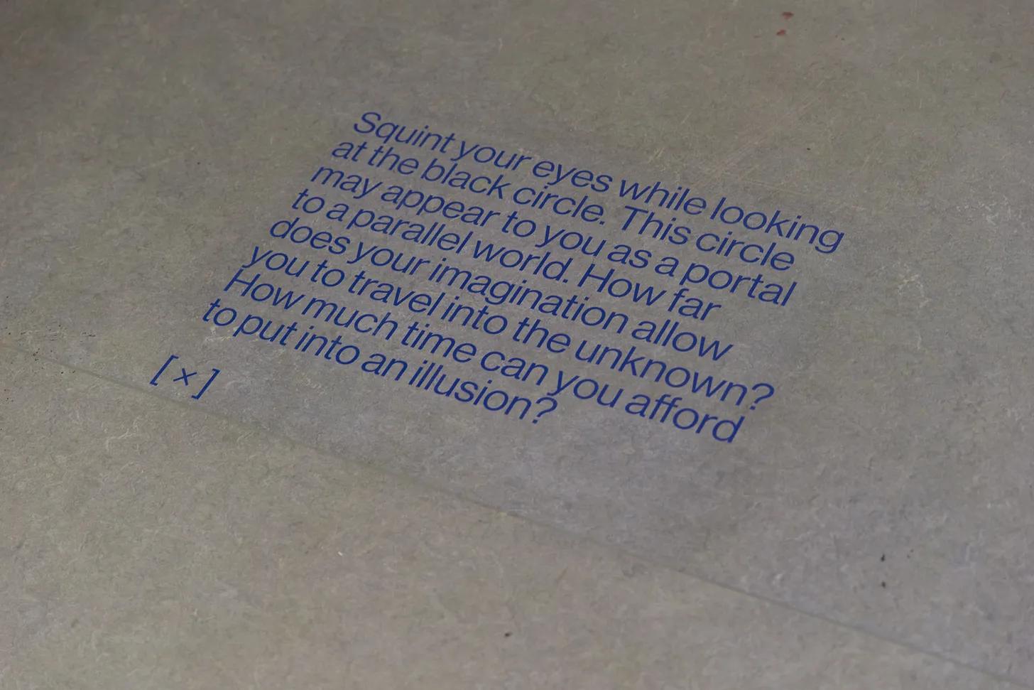 Before The Hologram became a social project in 2020, when I was doing more traditional artwork, I produced an exhibition for a curator named Magda Hartelova at the Gallery of Fine Arts in Prague. We took a big round table that was used for a prior exhibition. It was going to be thrown away, and so we painted it matte black, and we hung it on a giant white wall and lit it from the back. It created a cheap optical illusion of a big hole in the wall, a portal. If you stood far away from it at the opposite end of the gallery and squinted, maybe you could believe that you could go through it. The exhibition texts explained that a lot of people already did go through that hole. If you looked down on the floor while you were standing and staring at the hole, you could see something that said: How much time can you afford to put into an illusion?