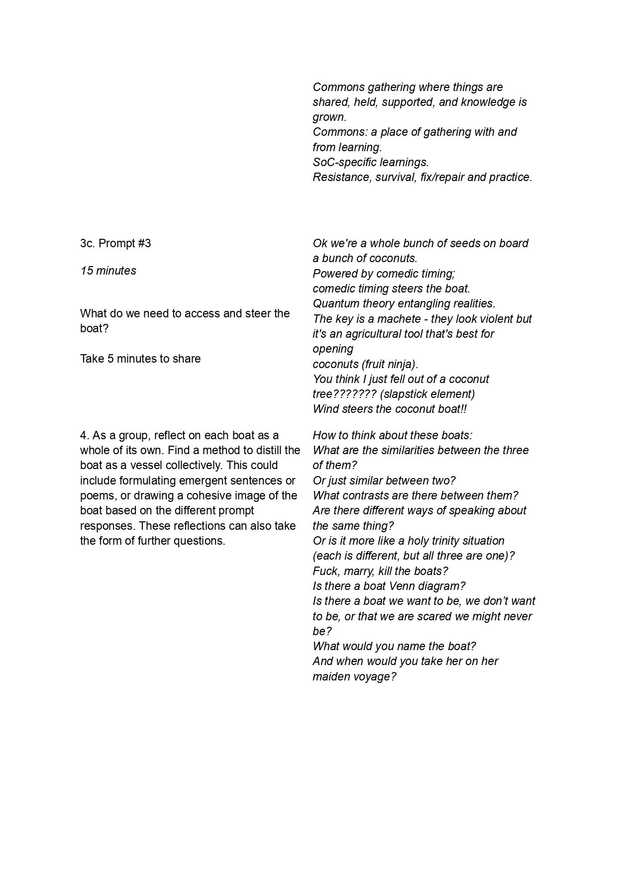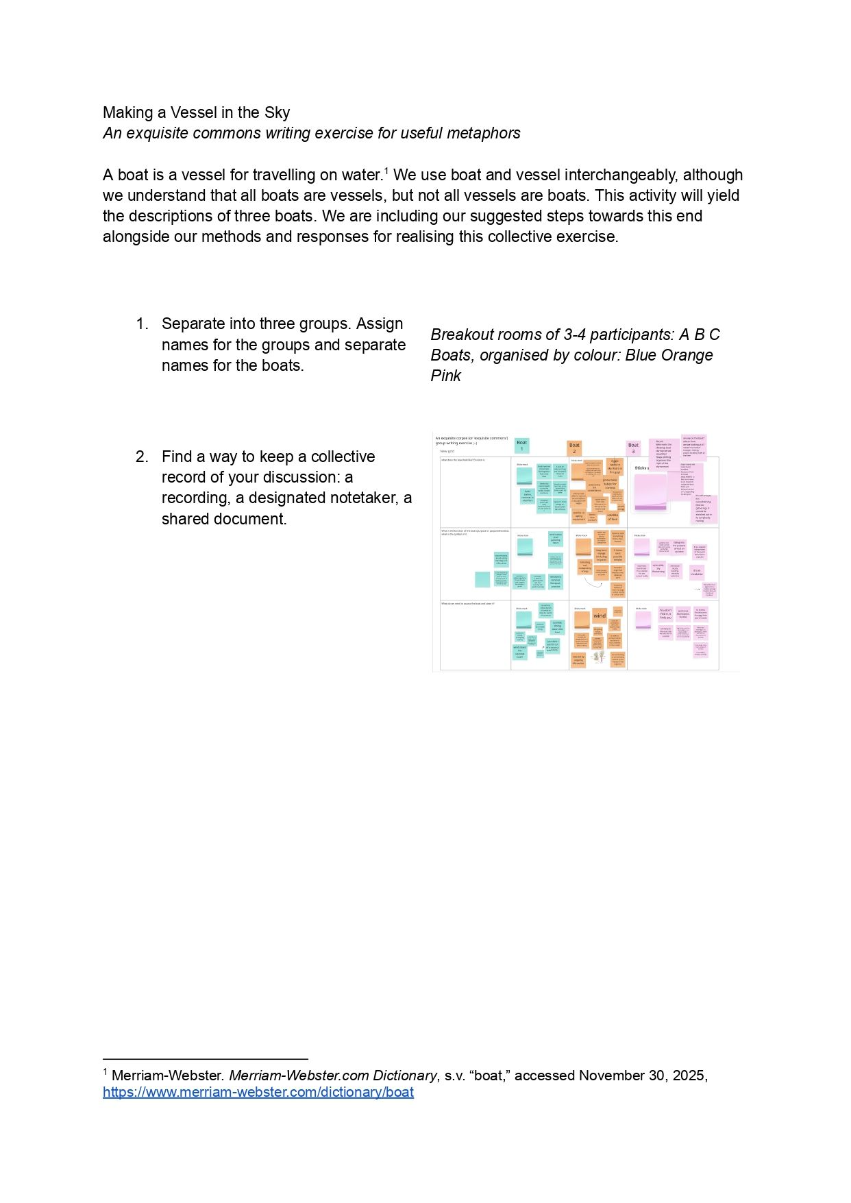 In this sense, the metafesto is not a declaration but a gesture of closeness. It is an orientation device for navigating uncertainty together. It tries to accompany artists and collectives, offering not instructions but invitations to reimagine, to reorganise, to remember that collective imagination can be a form of anchoring. It is a tool insofar as it allows others to replicate a metaphor that was useful for us. While thinking about a boat or groups of boats, the word ‘flotilla’ crossed our exchanges. This was initially floated as a name for this gathering of sky-boats, but we are mindful of its militaristic roots. Language itself can reproduce systems we aim to soften or transform. The discussion occurred in parallel with the Global Sumud Flotilla, a diverse assembly of people coming together in a collective mission, highlighting how ‘flotilla’ can also signify collective action, solidarity, and shared courage outside military contexts. At a moment marked by devastating violence, including the ongoing Palestinian genocide, disarming our vocabulary is part of disarming our thinking. This publication leans toward regenerative language, toward imagining the boat not as a war-formation but as a pilgrimage, a village, or a gift-giver.