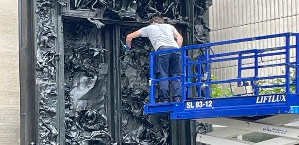 I can walk through Zurich and pass by the central train station. Switzerland is very proud of their punctual and well-ordered train system. Trains are expensive and clean, the extended office area of the well-paid employees commuting between the cities. The trains stand empty in Zurich station and people dressed in orange pass through them, collecting the waste, emptying the trash cans. They look tired and as if in a parallel world to all those in transit. I can walk through the city of Zurich and pass by the biggest art museum. They are very proud of their collection, giving a taste by positioning a huge bronze sculpture beside the main entrance for everyone to see. A person on a lifting platform stands close to the sculpture, wiping it clean with a cloth. I learn that after leaving the sculpture outside for many years where it was oxidizing and turning green, they changed their maintenance concept, reversed the oxidation process and applied layers of wax on the material which preserves the patina the way the artist had intended it 100 years ago—keeping the Gates as if no time had passed since then.